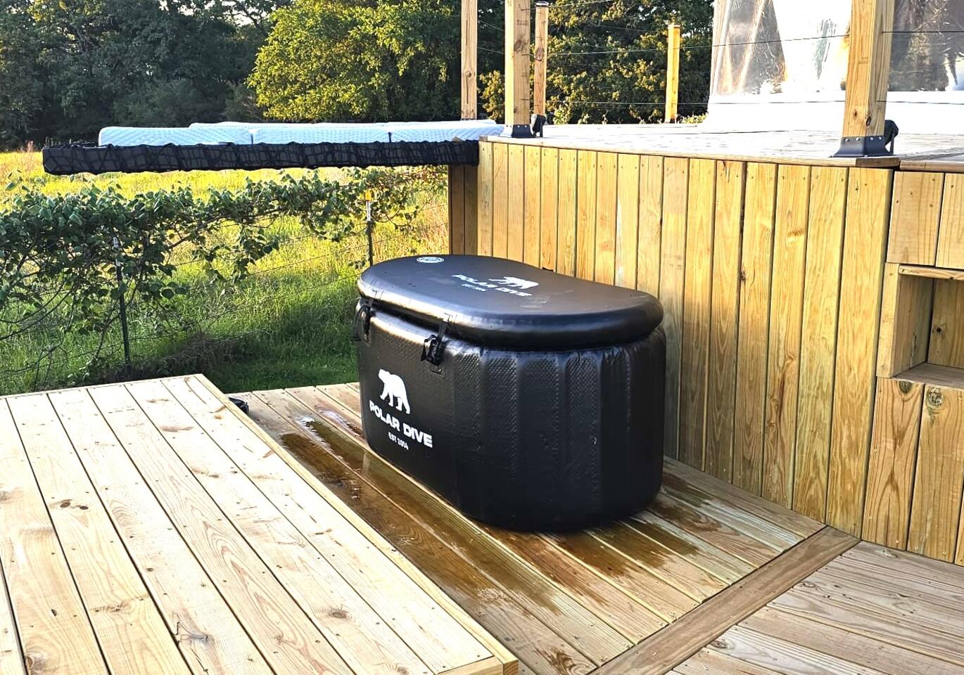 PLEASE NOTE THAT THE DOME’S WINDOWS HAVE BECOME OPAQUE AND ARE NO LONGER AS CLEAR AS SHOWN IN THE PHOTOS. WE’RE IN THE PROCESS OF REPLACING THEM, BUT FOR NOW THEY REMAIN OPAQUE. THANK YOU FOR YOUR UNDERSTANDING AS WE ADDRESS THIS MATTER. The main level features a king-size bed, two sofa chairs, and a dining table with four chairs. A huge open window offers incredible views of the sunset and starlit sky. The loft provides a warm, cozy space with two sofa chairs that open into thick single-size mattresses and a soft foam floor. Additionally, two single-size beds are available upon request for extra guests. The kitchenette includes a microwave, refrigerator, Keurig coffee machine, and a cooktop with pots and pans. It is fully stocked with dining ware, glassware, and utensils for convenience. The dome is equipped with split-unit heating and cooling for year-round comfort, while an air vent at the top improves air circulation. A wood fireplace adds warmth and ambiance, and extra space heaters are available for colder nights. Your bathroom features a marble-top double vanity, a beautiful claw-foot tub, and a self-cleaning bidet toilet, with plush towels provided. The wraparound deck is perfect for enjoying your morning coffee or an evening glass of wine. String lights create a warm nighttime ambiance. Relax and recharge with our newly added 750 gallon hot tub, and our cold plunge! Perfect for wellness enthusiasts, athletes, or anyone looking to cool off after a hot tub soak or sauna session. Please note that the hot tub is chemical free, and uses Montmorillonite, a natural, volcanic clay to clean for a soothing and relaxing experience. Golden Pine is also home to Thunder, our friendly Longhorn bull who roams freely across the property!