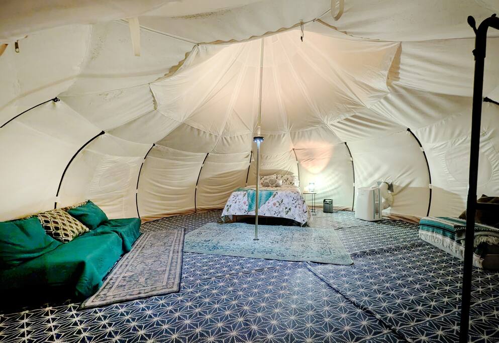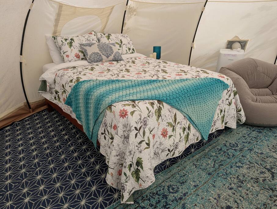 Stay in a 20' glamping tent surrounded by pine and cedar trees. It includes a queen bed, two sofas that sleep one each, with extra beds available for $20 each. The tent has heat/AC, a small fridge, free Wi-Fi, and access to a communal bathroom and shower. Free parking is on-site. Other structures are on the property, so you may encounter other guests during your stay. Thor, our gentle Longhorn, roams our adjacent fenced lot so come say hi!